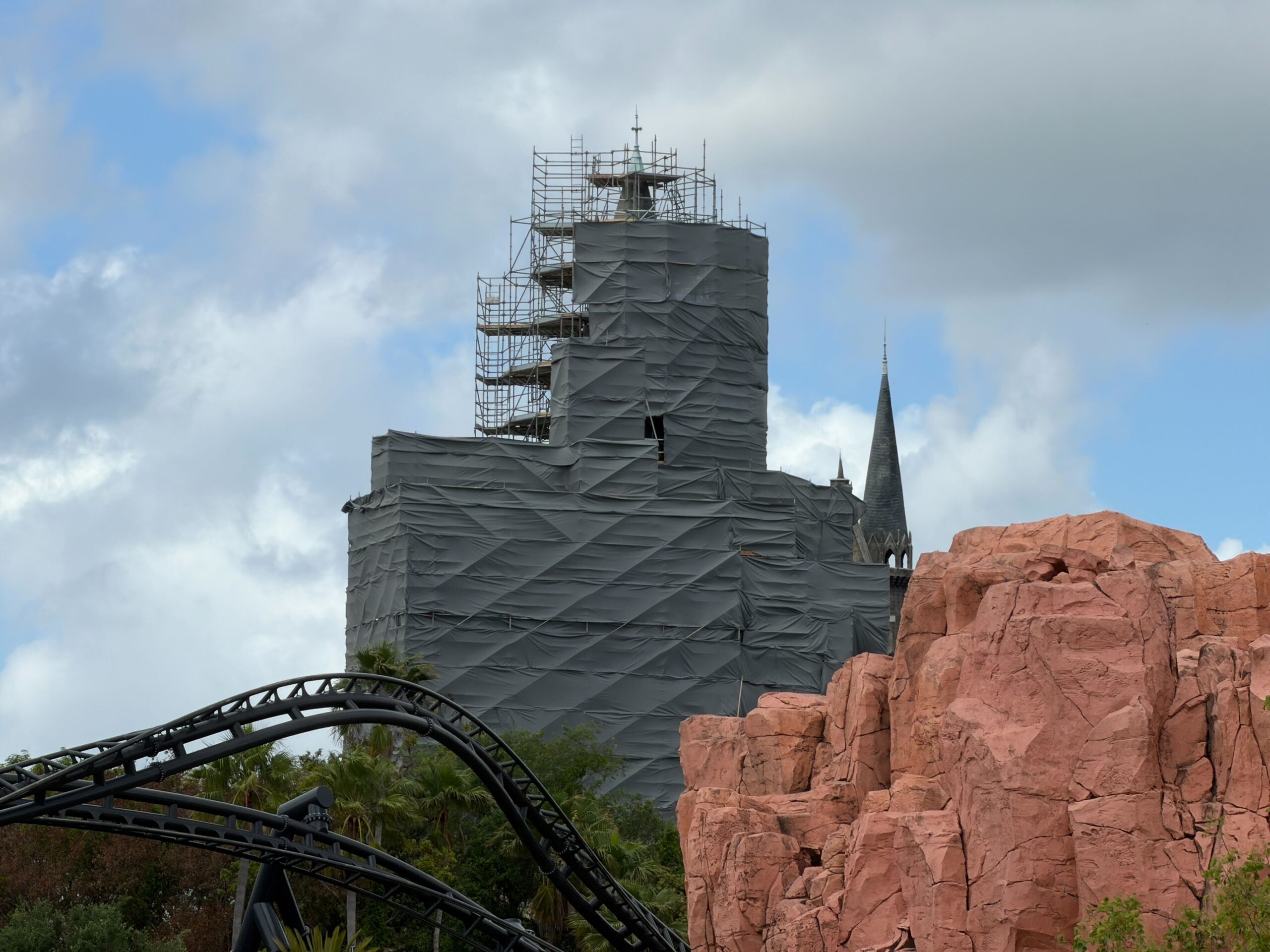 Inside the Wizarding World, only a few towers on the right and some lower walls are visible. Unfortunately, guests won’t be able to get picturesque castle photos while this work is ongoing.