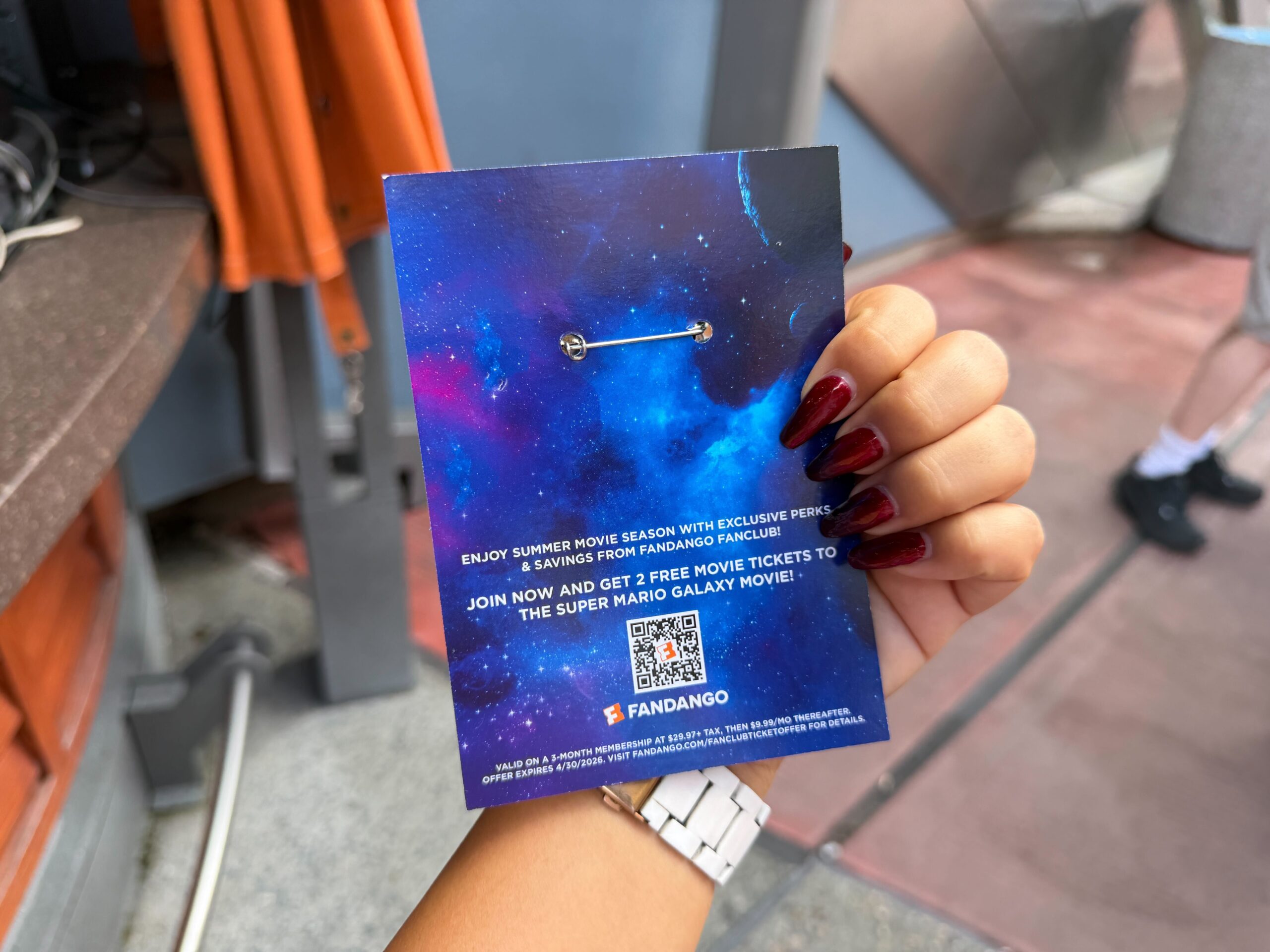 On the back of the card is a QR code leading to Fandango. Guests who become Fandango members receive two free movie tickets to The Super Mario Galaxy Movie.