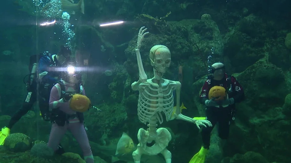 Divers transformed one of the aquarium’s exhibits into an underwater Halloween pumpkin carving station.