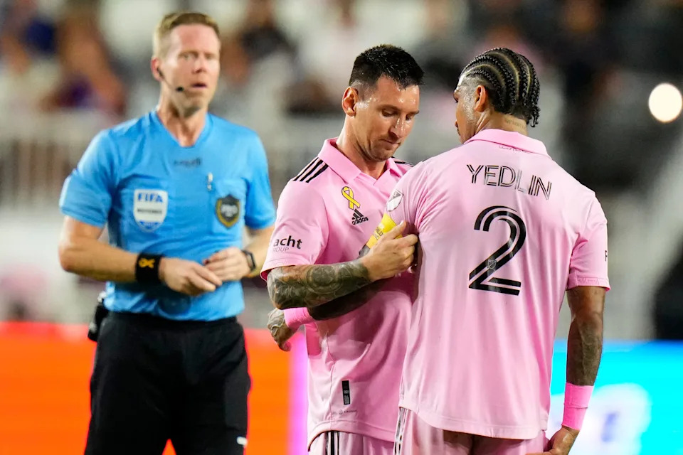 Sept. 20, 2023: Lionel Messi places the captains armband on defender DeAndre Yedlin after being subbed off during the first half of Inter Miami’s 4-0 win over Toronto FC at DRV PNK Stadium.