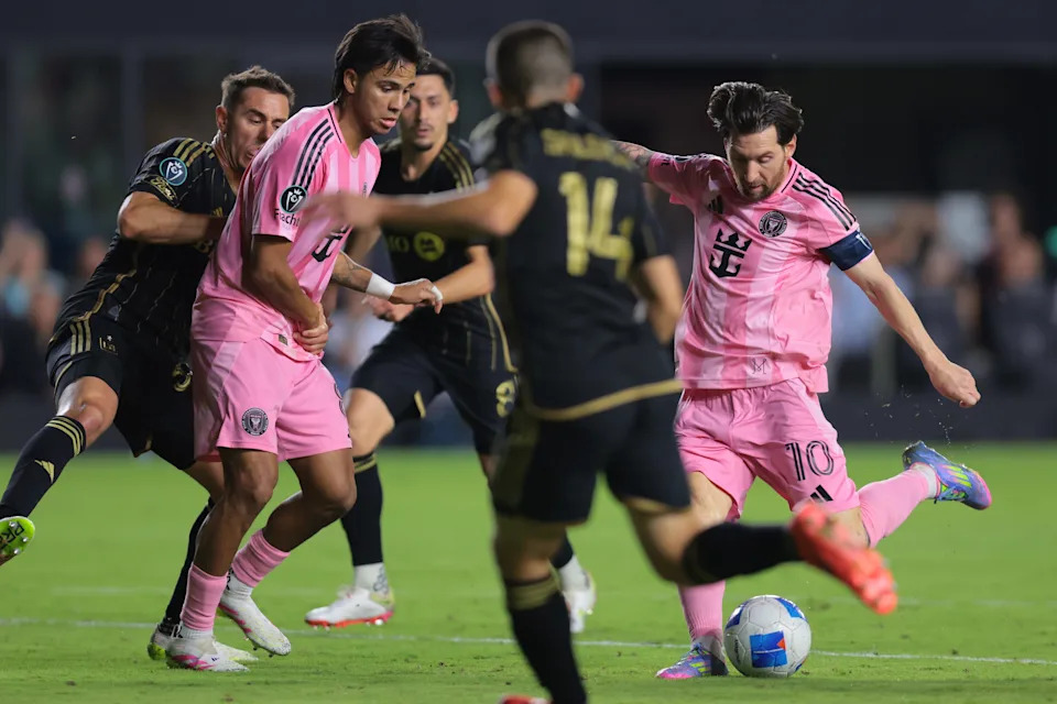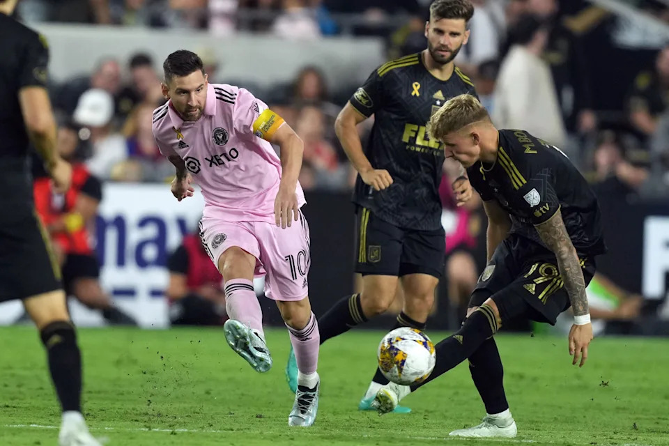 Sept. 3, 2023: Lionel Messi and Los Angeles FC’s Mateusz Bogusz (19) battle for the ball during the second half of Inter Miami’s 3-1 win at BMO Stadium.