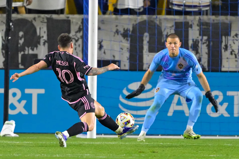 Feb. 25, 2024: Lionel Messi scores an equalizing goal past Los Angeles Galaxy goalkeeper John McCarthy during the second half at Dignity Health Sports Park. Messi’s goal salvaged a 1-1 draw for Inter Miami on the road in Carson, California.