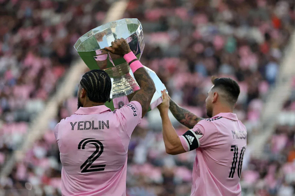 Aug. 30, 2023: Inter Miami’s DeAndre Yedlin (2) and Lionel Messi hoist the Leagues Cup trophy before the game against Nashville SC at DRV PNK Stadium.