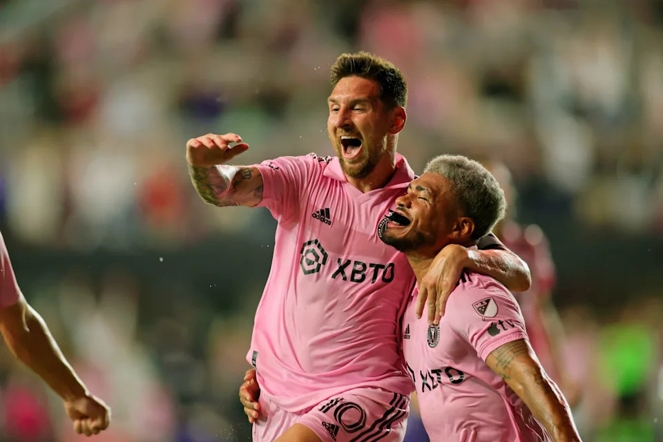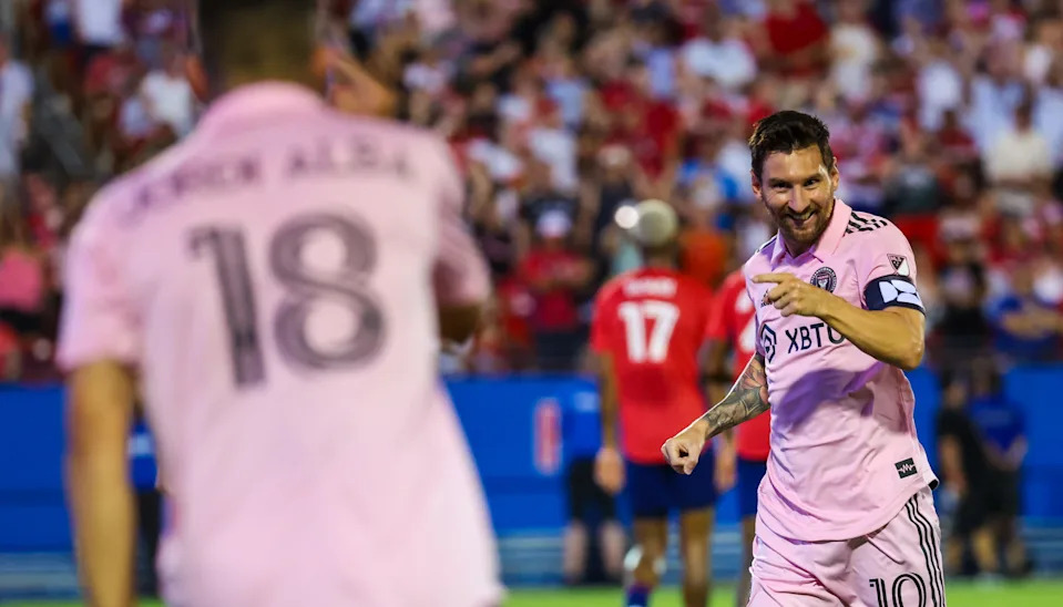 Aug. 6, 2023: Messi celebrates a goal against FC Dallas with teammate Jordi Alba.