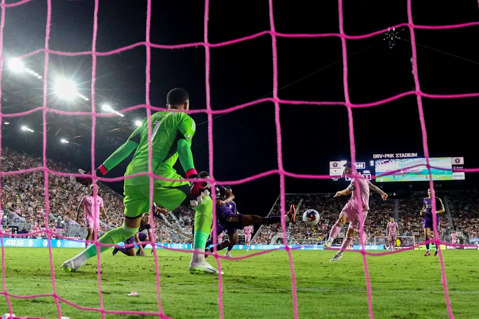 Aug. 2, 2023: Lionel Messi scores a goal past Orlando City SC goalkeeper Pedro Gallese during the Leagues Cup.