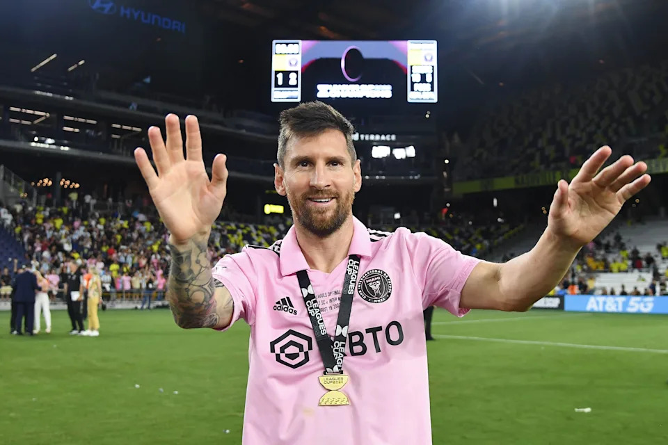 Aug. 19, 2023: Messi waves after winning the Leagues Cup final against Nashville.