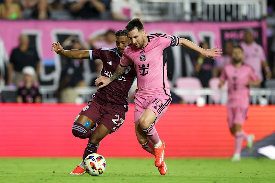 April 6, 2024: Lionel Messi and the Colorado Rapids’ Kimani Stewart-Baynes (27) battle for the ball during the second half at Chase Stadium. Messi scored a goal for Inter Miami in a 2-2 draw.