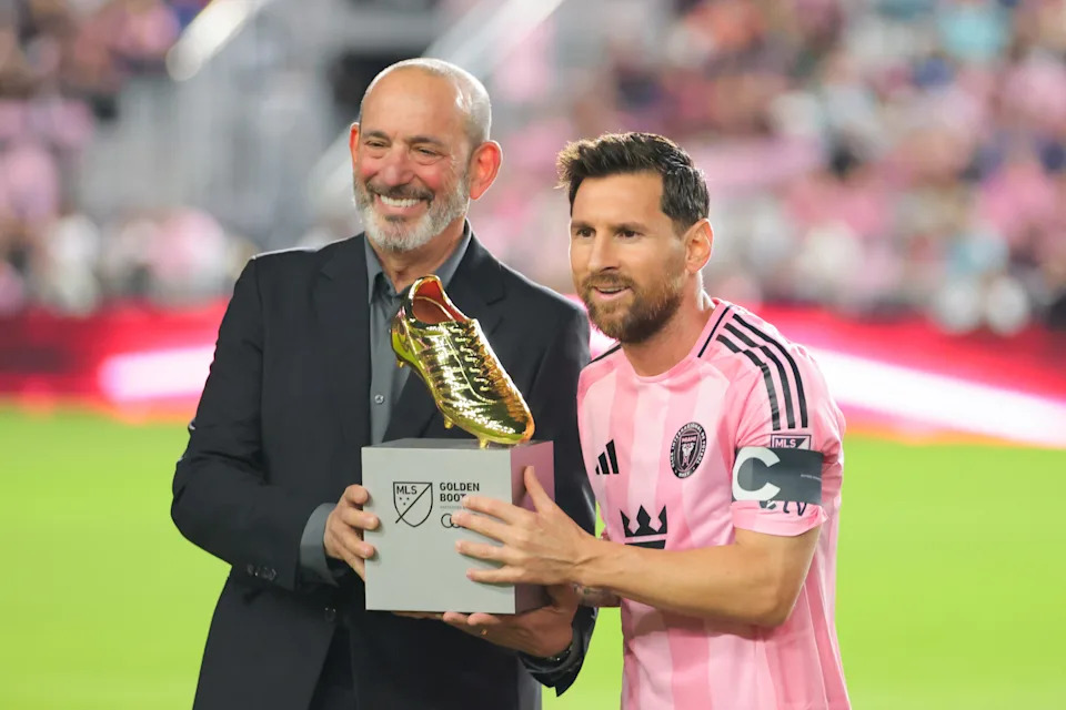 Oct. 24, 2025: MLS commissioner Don Garber presents the league’s Golden Boot award for the most goals scored during the regular season to Lionel Messi before a playoff game against Nashville SC at Chase Stadium. Messi led MLS with 29 goals scored during the 2025 season.