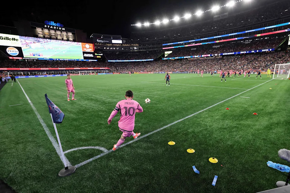 April 27, 2024: Lionel Messi attempts a corner kick against the New England Revolution at Gillette Stadium. Messi scored two goals in Inter Miami’s 4-1 win. A crowd of 65,612 showed up at Gillette Stadium, setting a New England Revolution home attendance record (previous high: 61,316 for 2002 MLS Cup).