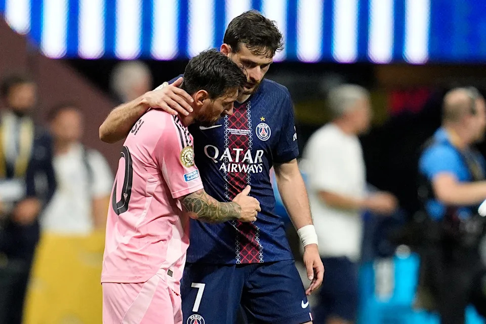 June 29, 2025: Lionel Messi is consoled by Paris Saint-Germain’s Khvicha Kvaratskhelia during Inter Miami’s 4-0 loss to PSG in the Round of 16 of the FIFA Club World Cup at Mercedes-Benz Stadium.