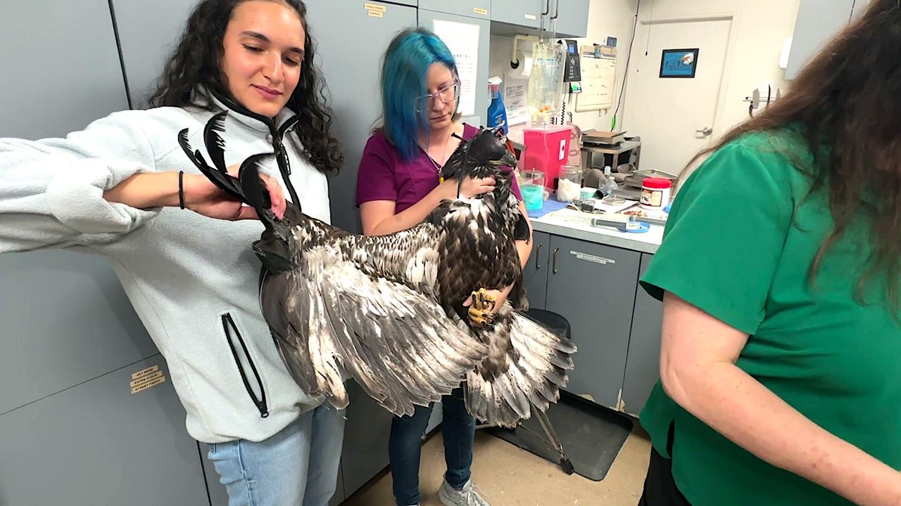 Raptor specialist Beth Lott and team rescue another bald eagle that was injured falling out of it’s nest. The young eagle will spend some time at Birds of Prey before it is released back into the wild. {Spectrum News/Randy Rauch)