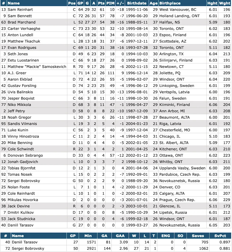 Potential scratches: Aaron Ekblad, Dmitry Kulikov, Sam Reinhart, Anton Lundell, Uvis Balinskis, Cole Reinhardt