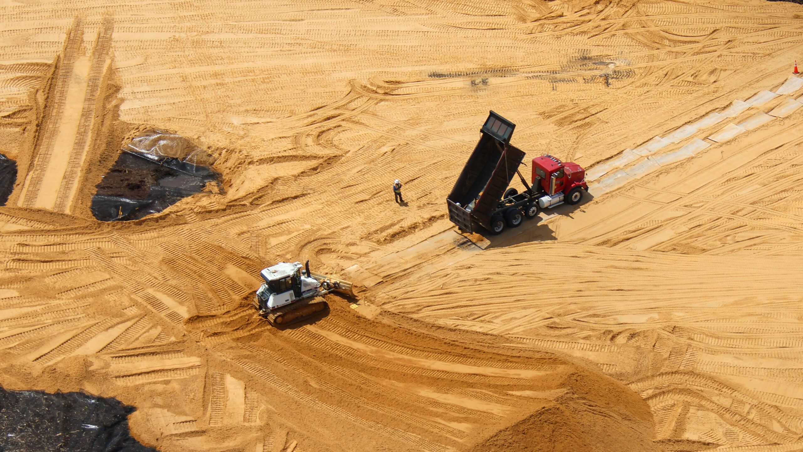 Dumping large quantities of sand on a given construction site is typically known as “mass grading”. Large sites are often covered with a broad layer of sand due to its use as a grading (leveling or sloping work on natural uneven terrain), drainage, and load-distribution material.