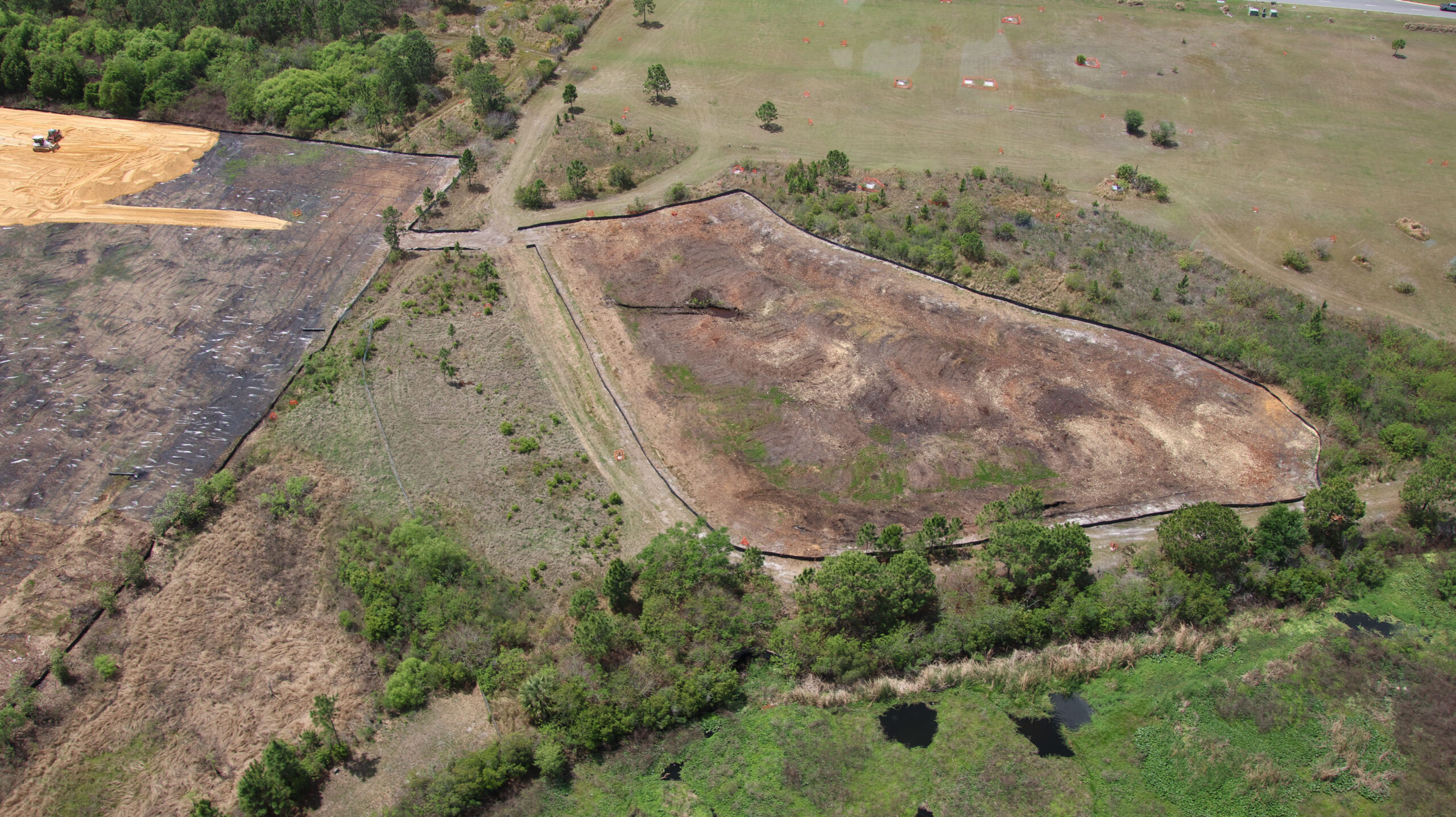 Aerial video of site preparation in a spur of the Epic Universe property.