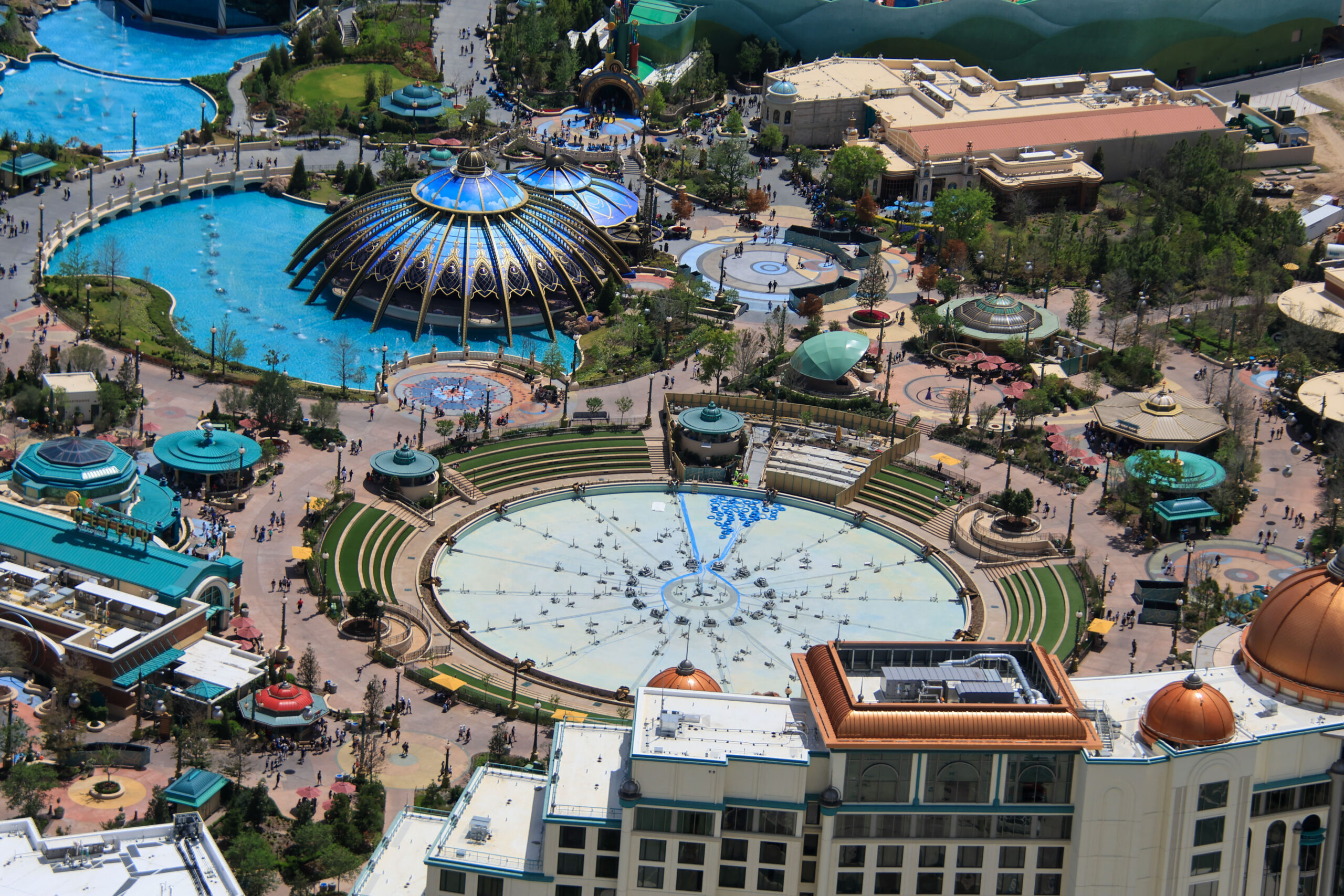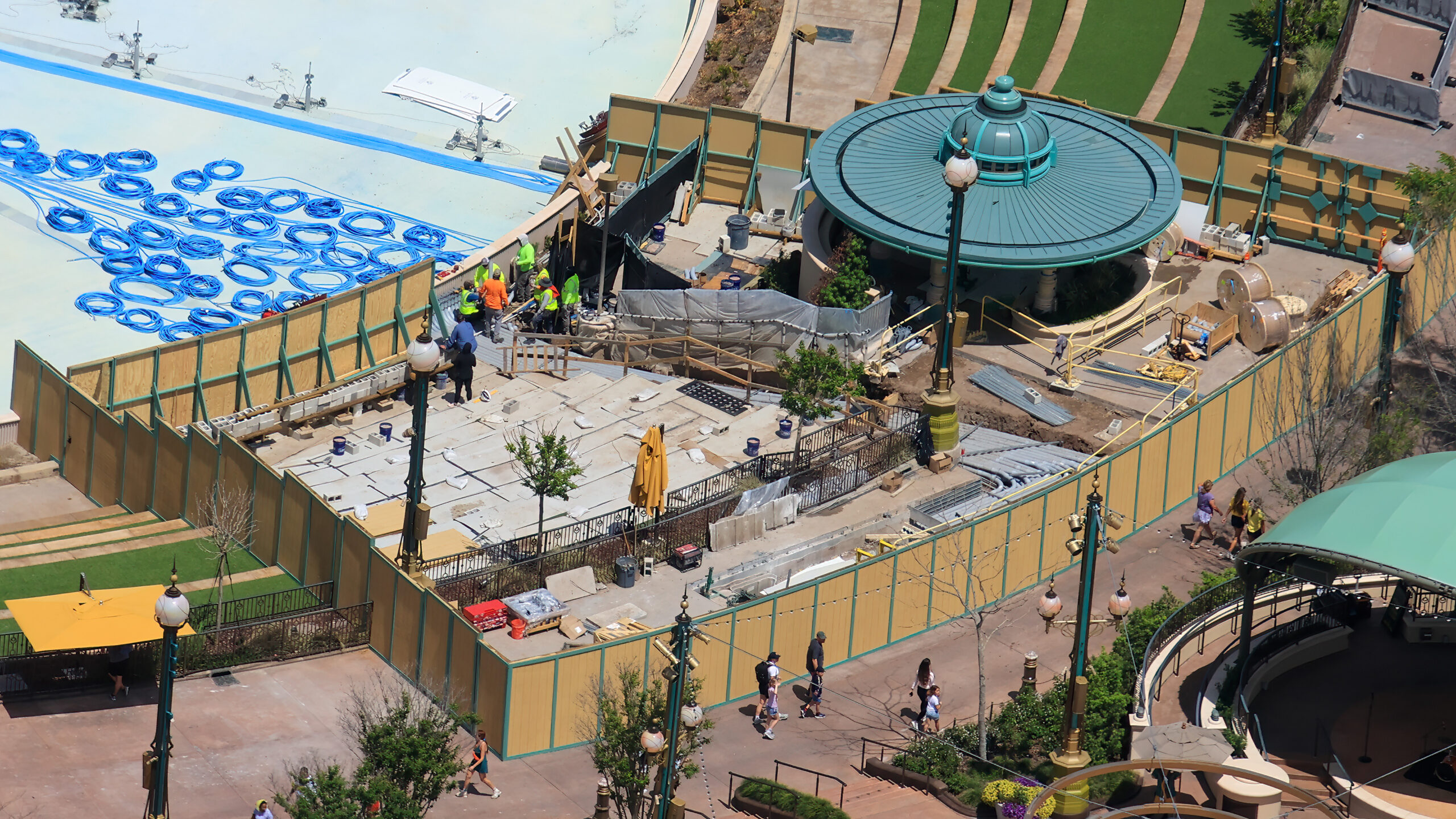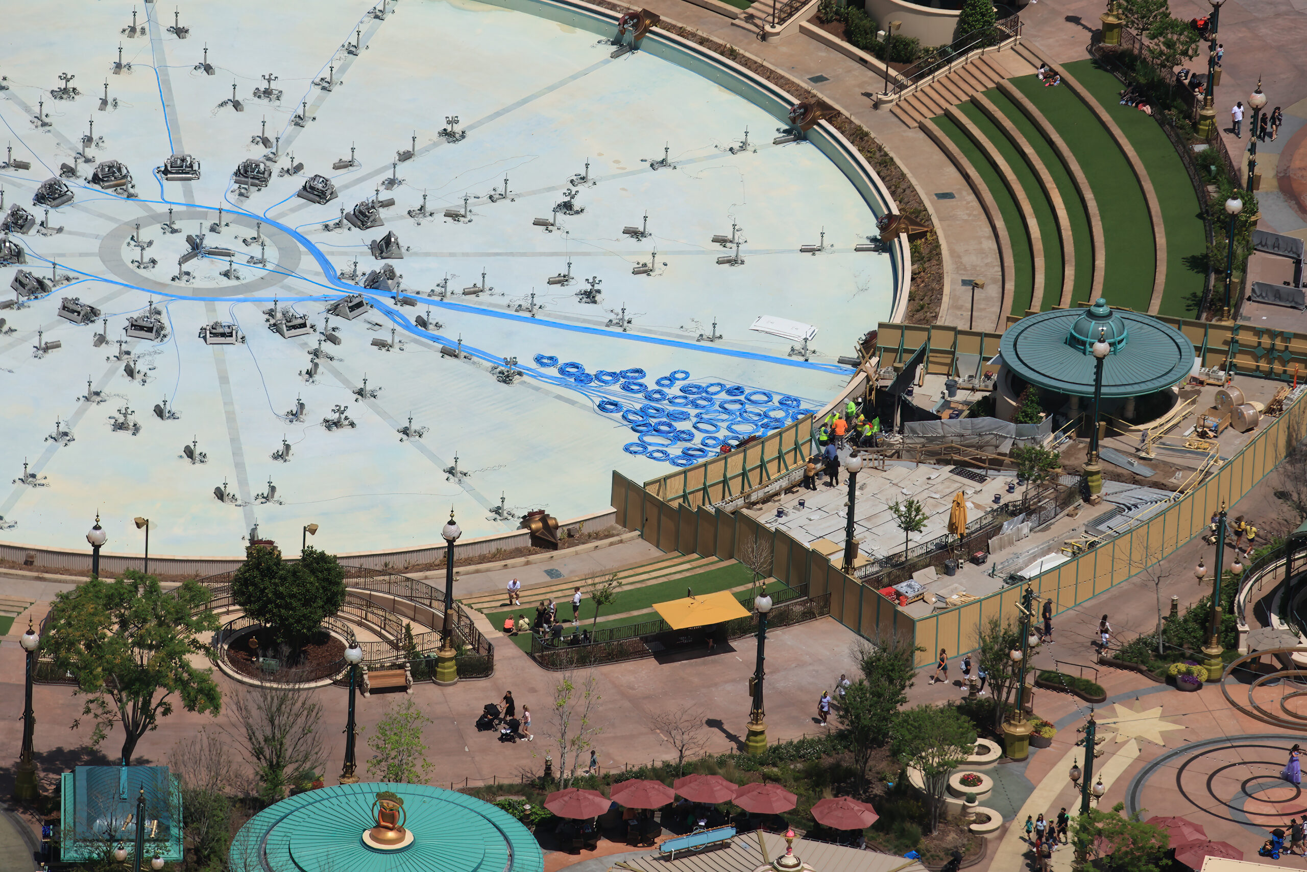 The aerial angles reveal one area of the fountain’s grassy esplanade that is otherwise totally walled off from the view of regular park guests. In this fenced-in area, we can see a small gathering of workers right on the fountain’s edge, surrounded by various construction materials and other temporary fixtures.