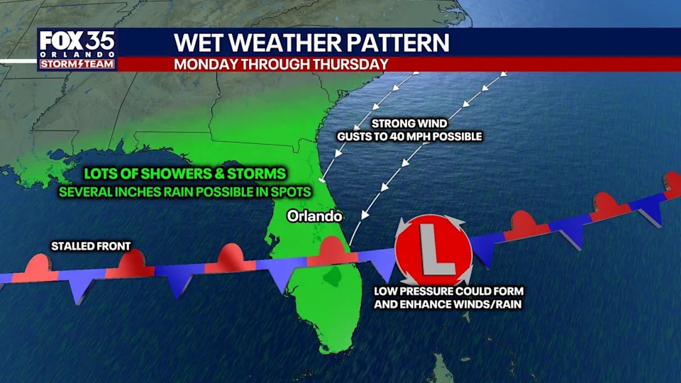 The unsettled weather pattern holds through the first half of the workweek as this front hangs up across the Sunshine State. With that, multiple rounds of showers and storms are on the table.