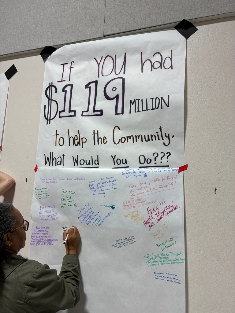 “Disney has the legal right to sue. They’re not doing anything that they’re not allowed to do, but they also don’t have to. They could drop the lawsuits, and they could also agree to give that money for our schools and teachers here,” said Ella Wood, an organizer with one of the Disney World unions Unite Here Local 737, speaking to a crowd gathered at a local community center Thursday night.