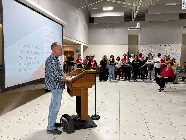 Orange County Classroom Teachers Association president Clinton McCracken speaks about issues facing teachers at a town hall focused on Disney World’s property tax lawsuits on April 2, 2026. Credit: McKenna Schueler