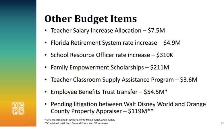 Orange County Public Schools highlighted pending litigation involving Disney during a 2025-26 budget presentation. Credit: Orange County Public Schools