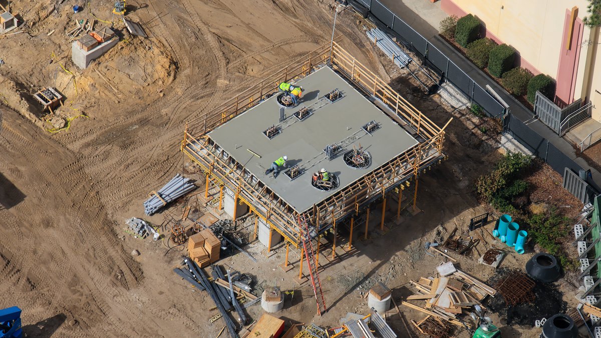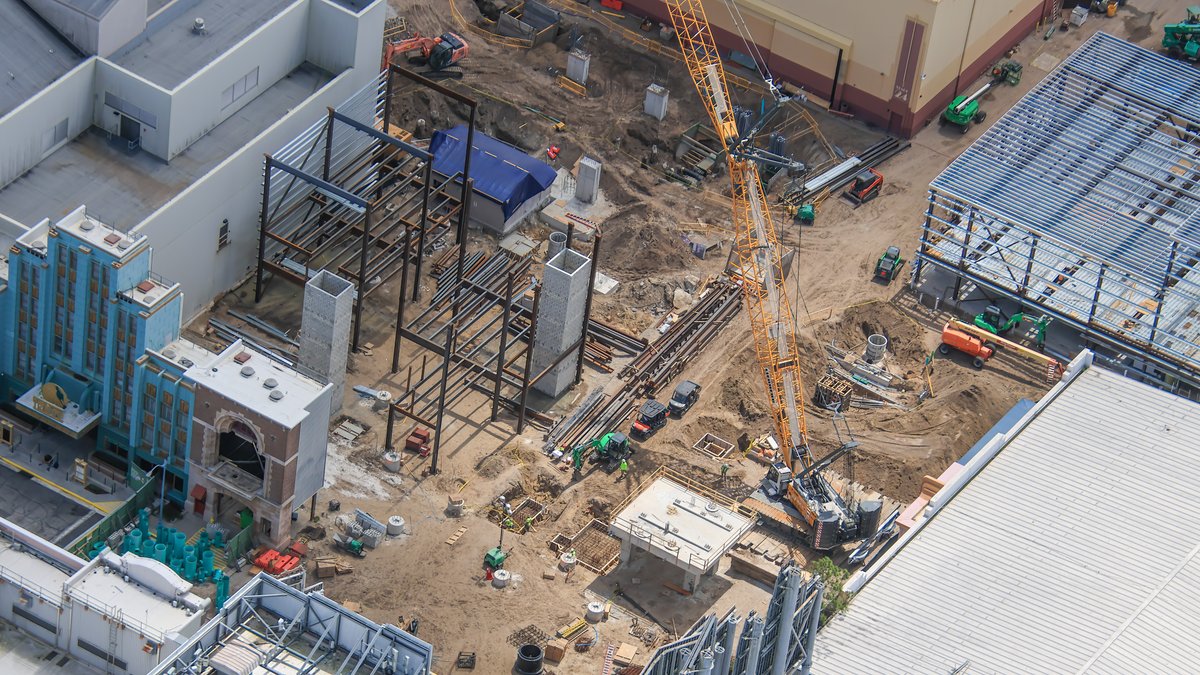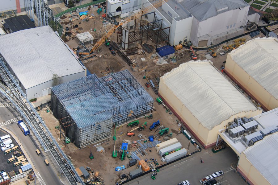 This aerial photo shows a large portion of the work site for the new attraction. On the left center, the guest loading station and the service building is in progress in the back.