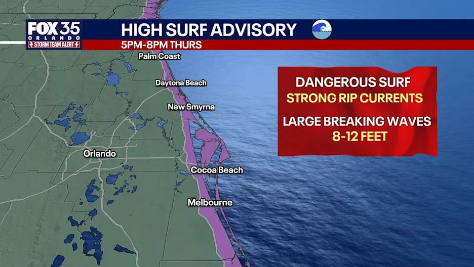 In place from 5 p.m. Tuesday until 8 p.m. Thursday for Brevard, Volusia, and Flagler counties. As onshore winds increase, dangerously rough surf is likely. Large breaking waves will be as high as 8–12 feet.