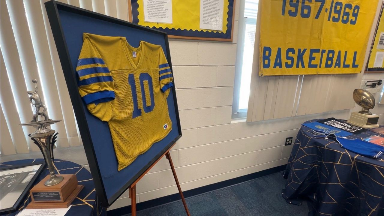 The No. 10 jersey worn by former Tampa Bay Buccaneers quarterback Shaun King. He played at Gibbs. (Spectrum News/Jeff Butera)