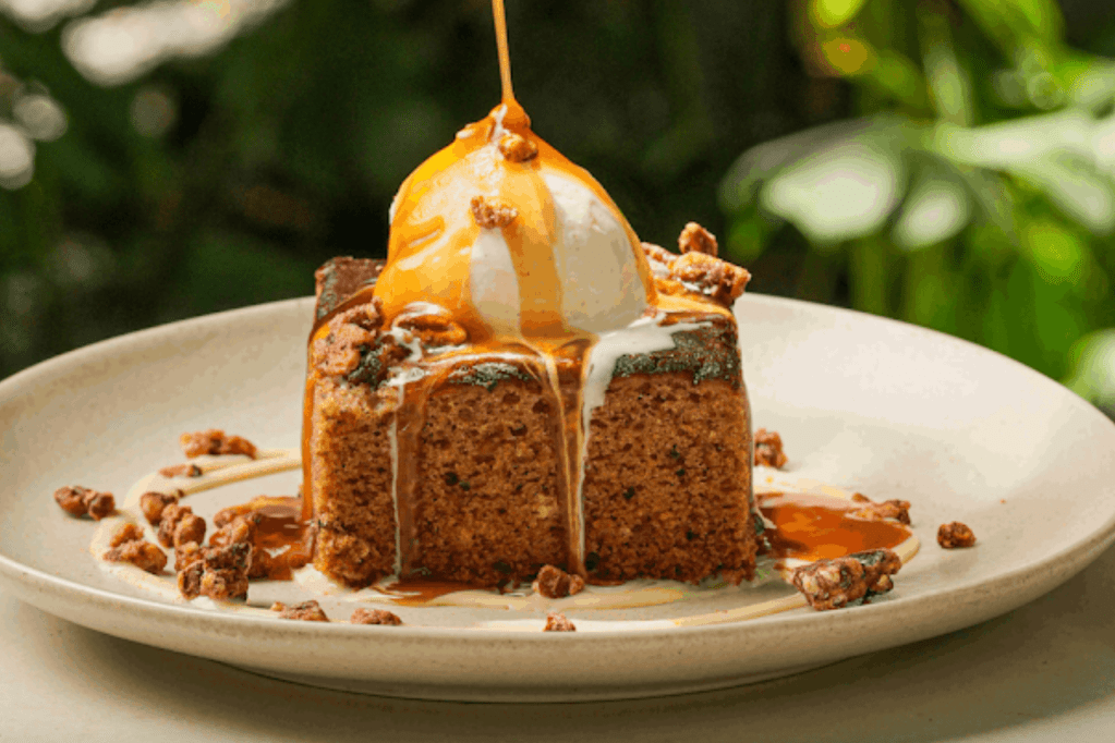 Moxies features a Sticky Toffee Pudding on its dessert menu, served warm with a rich buttery caramel sauce, whiskey crème anglaise, candied pecans, and a scoop of French vanilla ice cream.