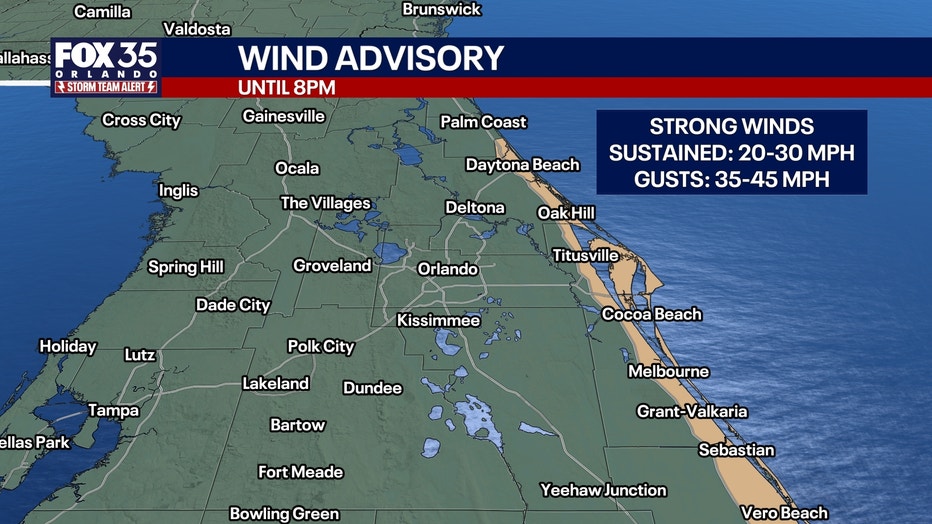 A Wind Advisory is in effect for Brevard and Volusia counties until 8pm. Sustained winds will reach speeds of up to 20-30 mph with gusts near the coast up to 45 mph.
