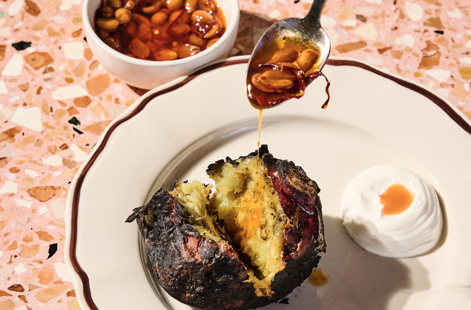 As for sides, the sweet potato with charcoal is the way to go. Slow-cooked, then finished directly over coals until the skin is completely blackened, it’s cut open at the table and layered with salsa macha, sautéed strands of seeded guajillo chile, roasted peanuts, and a reduction made from the sweet potato’s own juices. Don’t skip the skin — that’s where the flavor is.