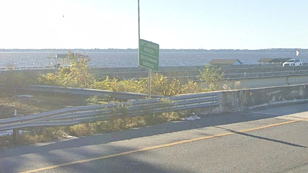 A sign identifies the Buckman Bridge over the St. Johns River.