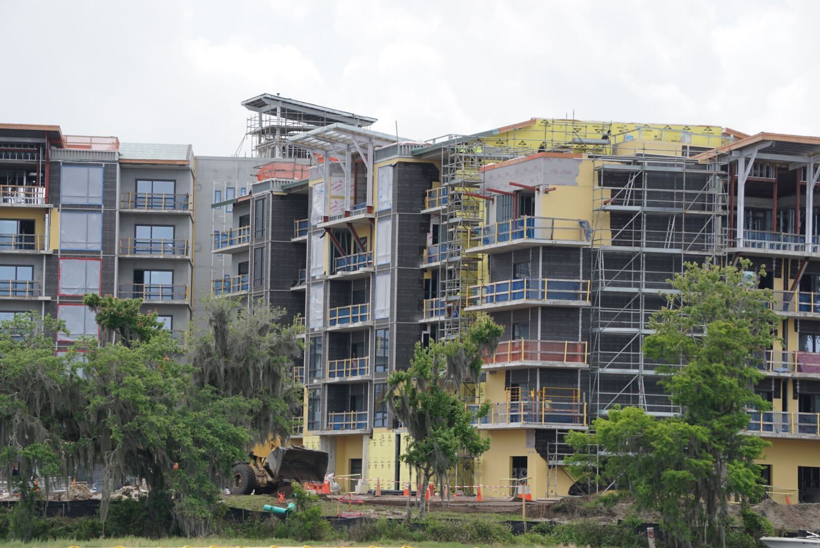Other parts of the buildings still have the balcony bases complete and scaffolding up, but no railings yet.