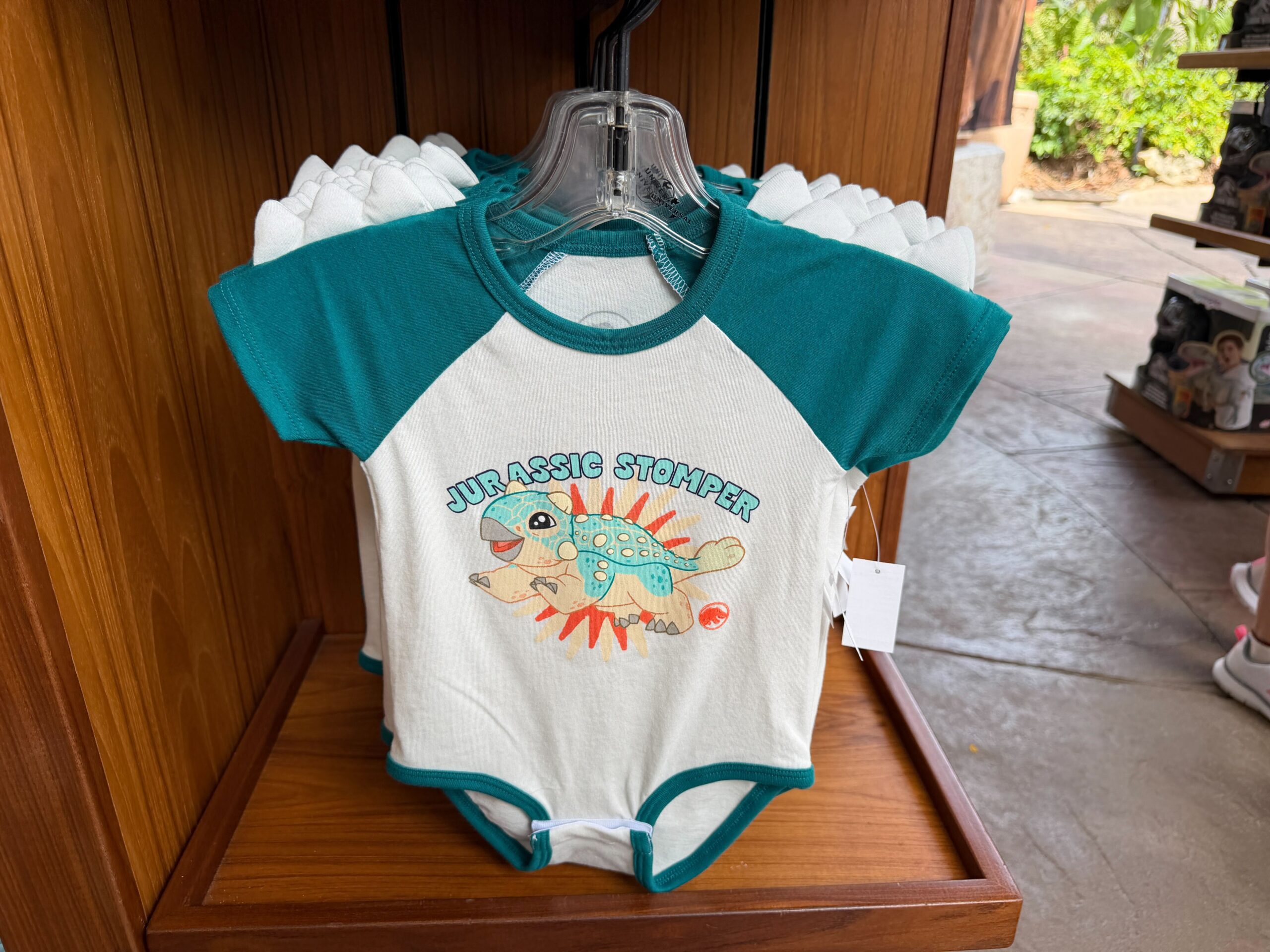 This infant onesie features a white and sea-green baseball t-shirt design, with a cutesy graphic of Bumpy positioned in a starburst graphic on the center of the torso. “Jurassic Stomper” is printed over the playful ankylosaurus.