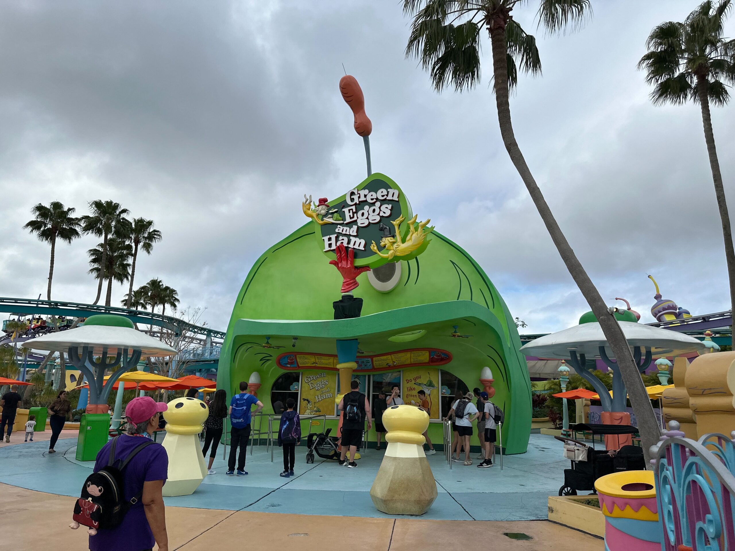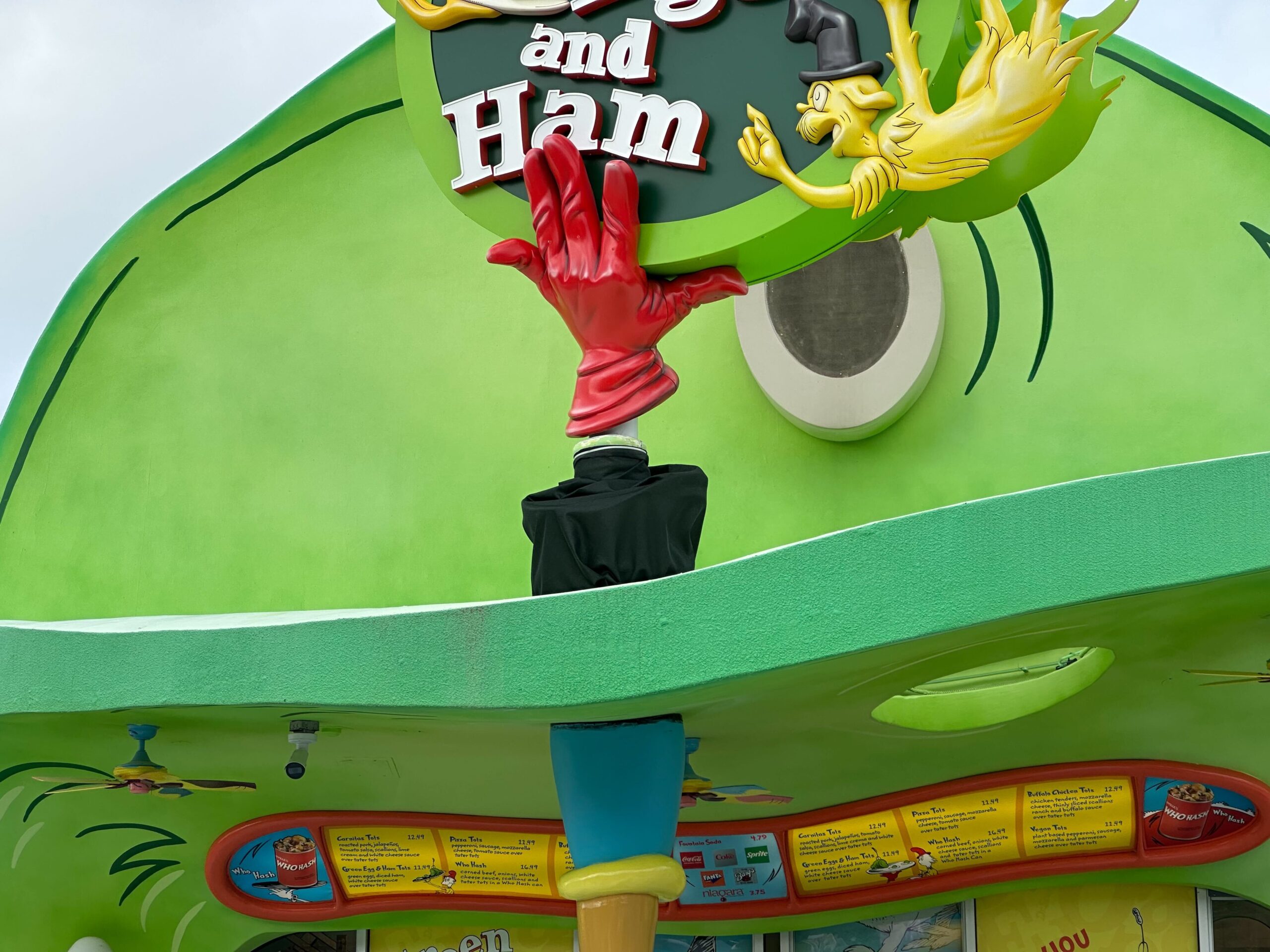 The scrim may have been removed from the Green Eggs and Ham Cafe in Islands of Adventure, but the sign is still missing.