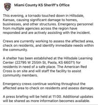 “Tornado touched down in Hillsdale, Kansas, causing significant damage to homes, businesses, and other structures. Emergency personnel from multiple agencies across the region have responded and are actively assisting with the incident.”