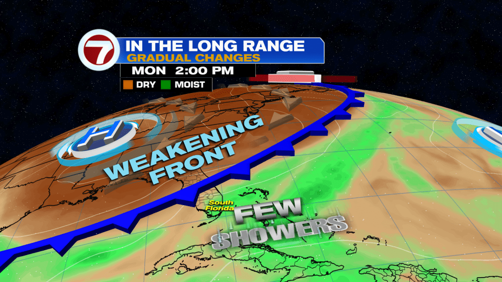 In the long range, we’ll have to focus on a sagging front moving into Florida (early next week). It’ll be weak but seemingly have the potential for tapping moisture for times of rain.