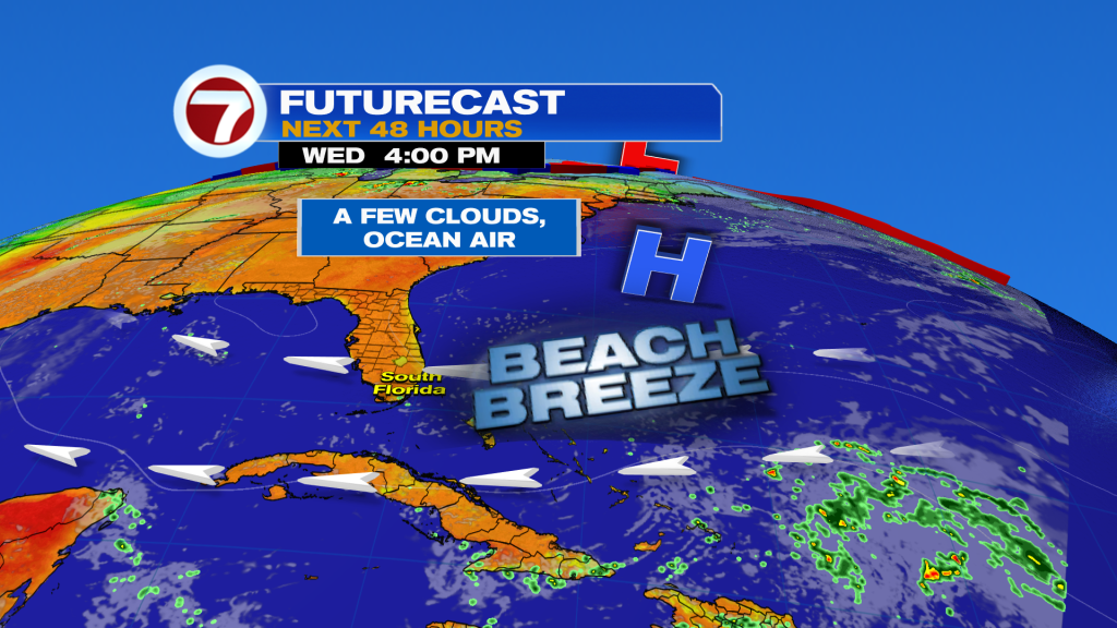 The main takeaway is that High Pressure (centered northeast of the Bahamas) will continue to “bridge” into Florida. As such, it’ll be in weaker fashion than earlier this week. While Winds decrease it’s still an ongoing onshore flow. Some of our forecast models show a brief sprinkle, or two, passing along the same breeze. For most locations? Mild and generally dry from Wednesday through the end of the week!