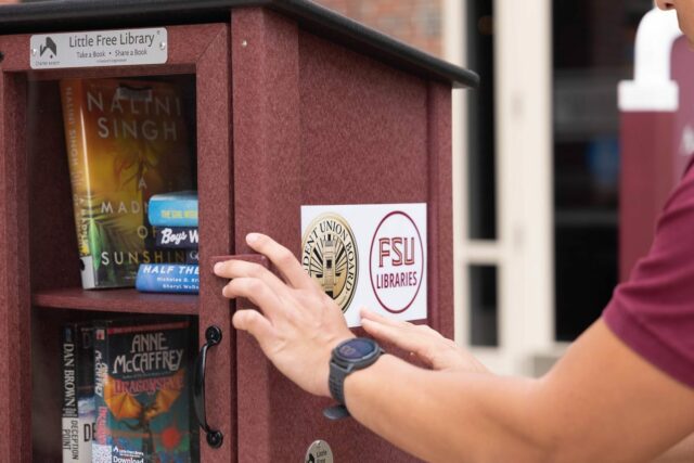 “We are all about increasing access and connecting with students where they actually live and gather, and this little free library is a great extension of our mission because it creates a unique connection where you’re taking part in another person’s experience when you take a book,” said Crystal Matthews, FSU Libraries student engagement librarian.