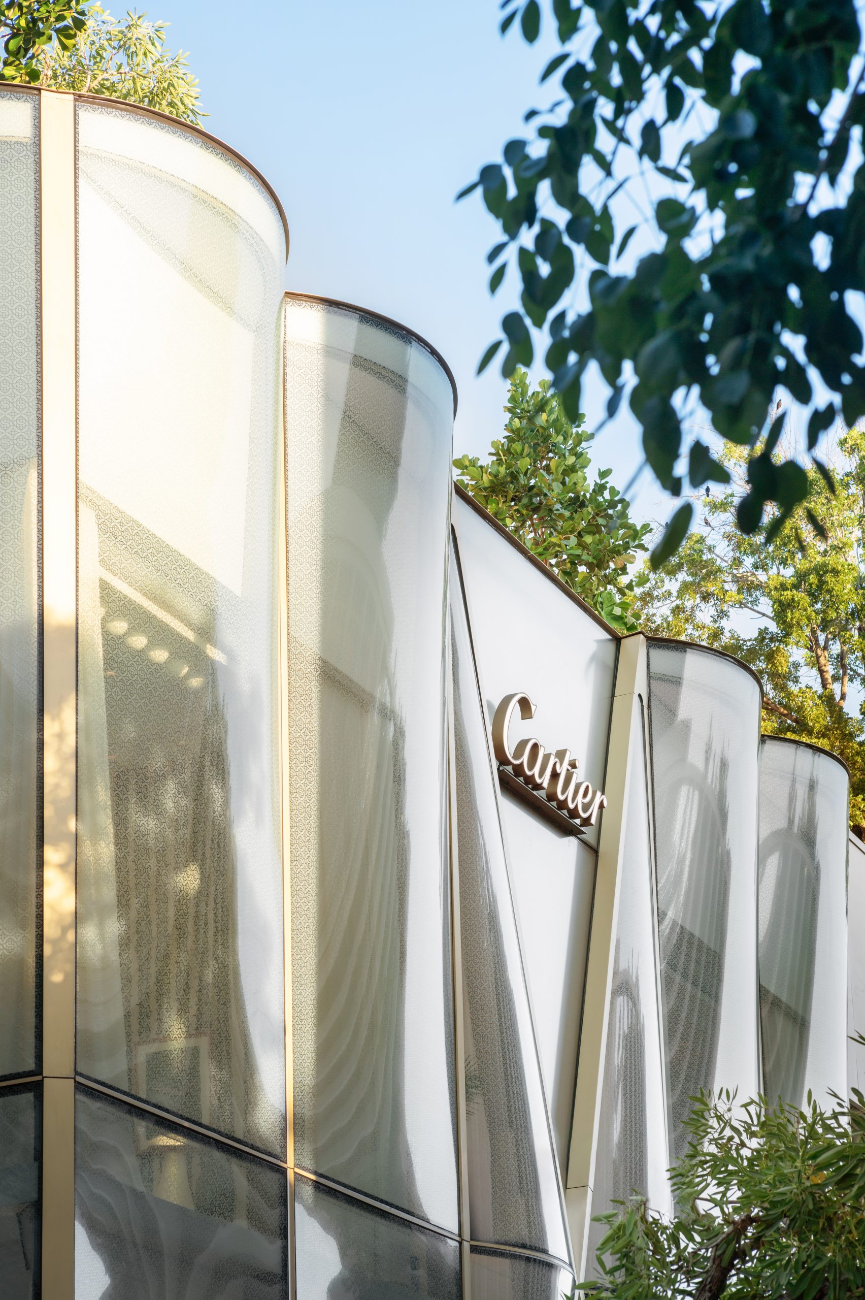 The façade, conceived by longtime collaborators Diller Scofidio + Renfro, is an architectural statement in motion. A wraparound wave of undulating glass, etched with a pattern inspired by a 1909 Cartier brooch, creates a play of light and shadow — revealing just enough to intrigue.