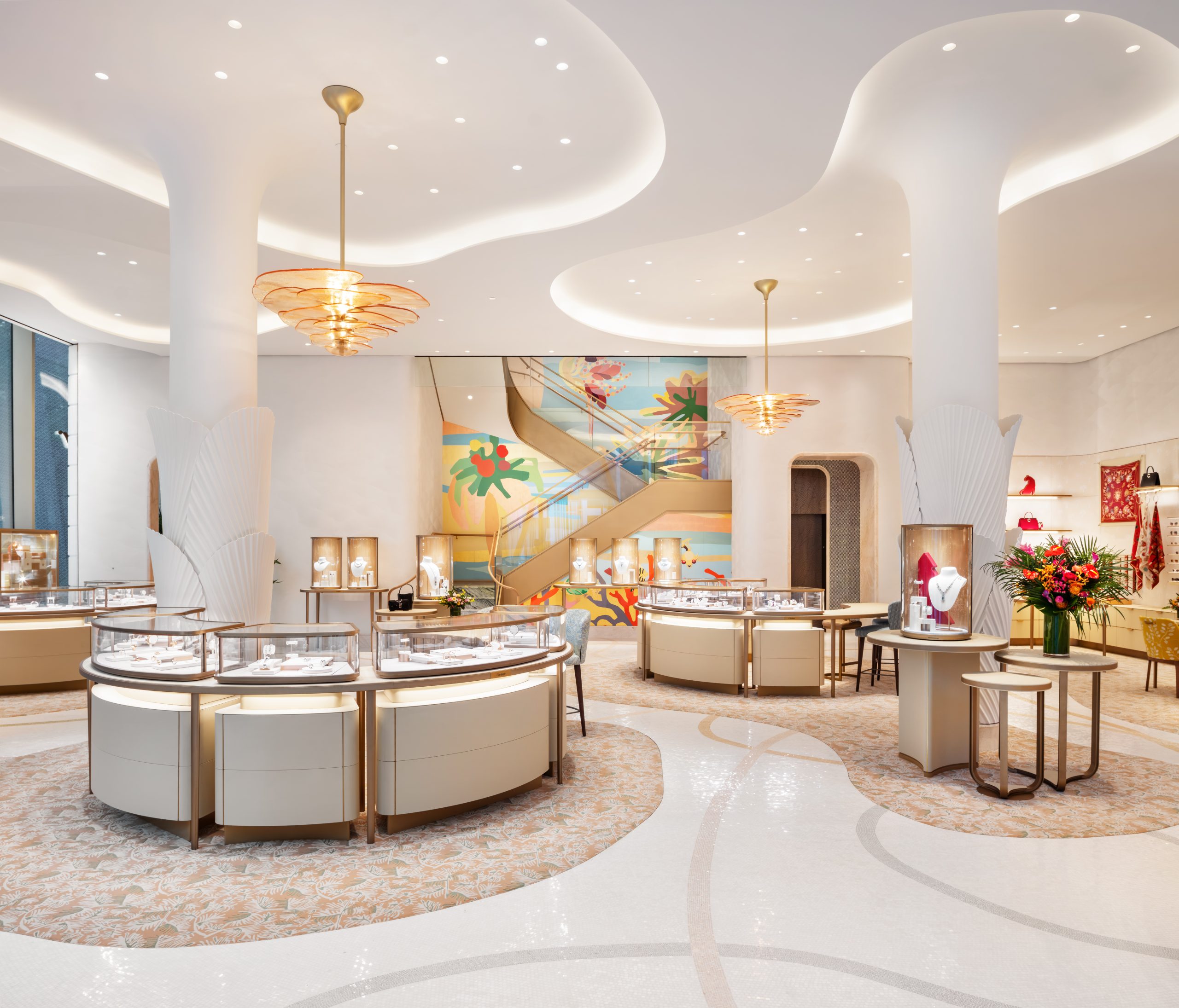 A sculptural seashell staircase spirals upward, connecting each floor and guiding guests through a gallery of Cartier’s most celebrated creations — from jewelry and fine watches to fragrance and leather goods. Leaf motifs climb columns on the first floor, while organic shapes and sunlit tones define the ground level. The journey culminates on the rooftop terrace, a serene garden of colorful tiles and lush greenery that captures the effortless joy of Miami living.