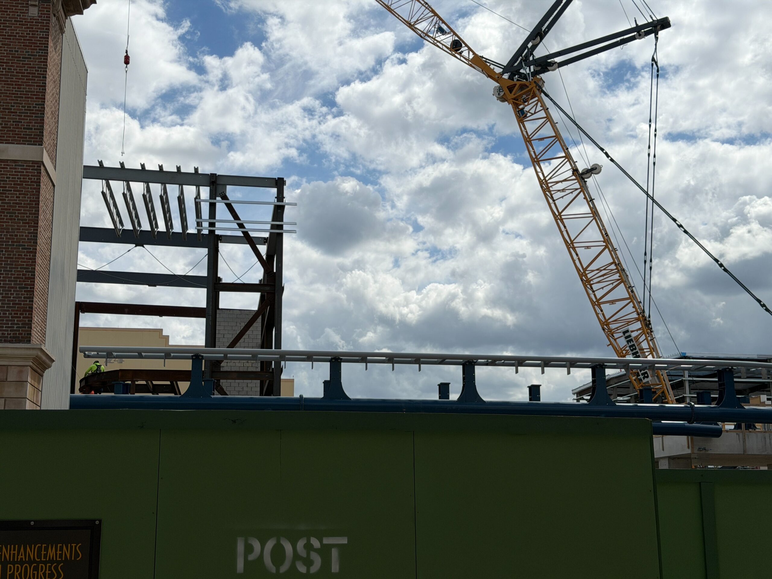 The visible section of track constructed thus far can be seen extending out from part of the ride’s facade, situated near the attraction’s future entrance, before taking a turn back toward the inner section of the ride area, oriented towards the new show buildings still under construction.