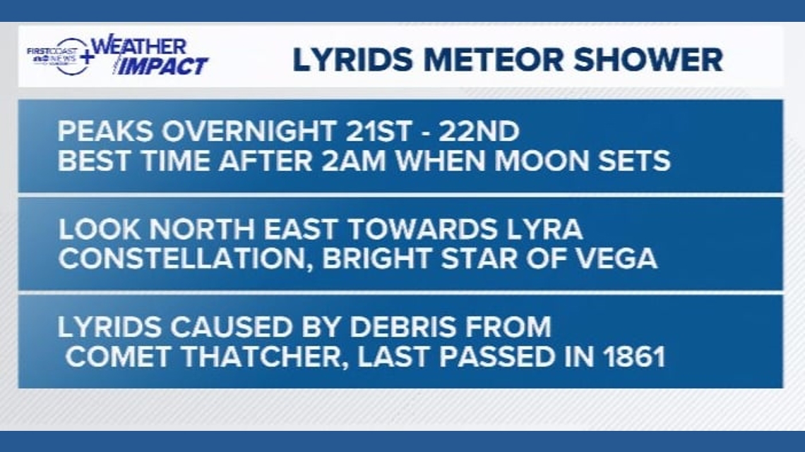 JACKSONVILLE, Fla. — The Annual Lyrid Meteor Shower peaks on April 21st and 22nd. Here is a look at the best time to view it and where to look.