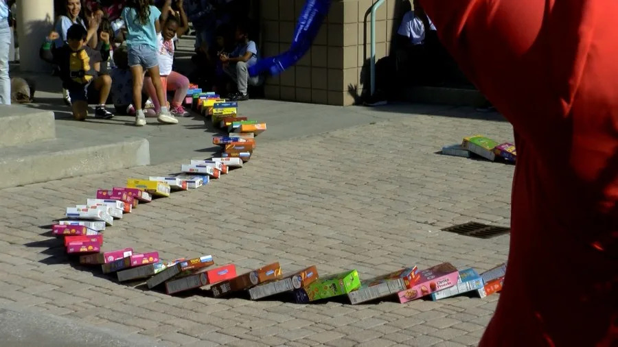 The school kicked off its engineering exposition, featuring a giant cereal domino run built with around 1,500 cereal boxes.