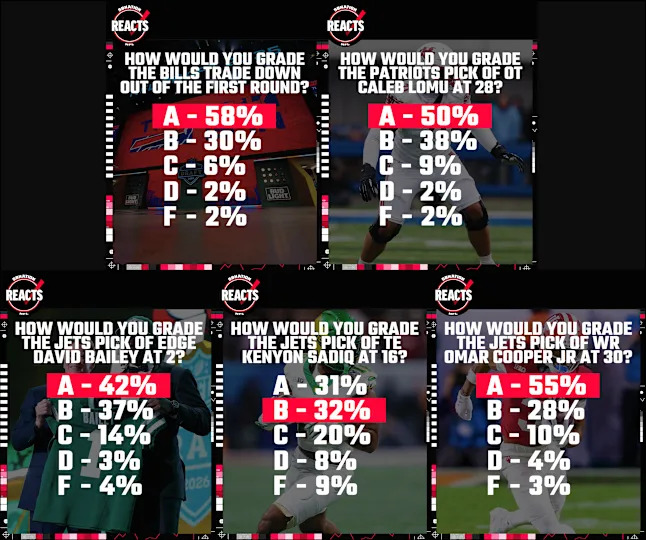 Like Miami, the Patriots made moves around the draft board on Thursday – including being a part of the Bills’ trades. New England made the 28th pick, just behind Miami’s selection of Johnson, and added Utah tackle Caleb Lomu. Their fan grade poll saw 50 percent of the response land on an A mark while another 38 percent gave it a B.