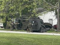 The man is currently in handcuffs and sitting in a SWAT truck. The SWAT team has entered the house with guns drawn.