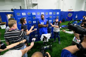 Defensive lineman Caleb Banks takes interviews during Pro Day inside the Heavener Football Training Center on March 26, 2026. [Noah Lantor/WRUF]