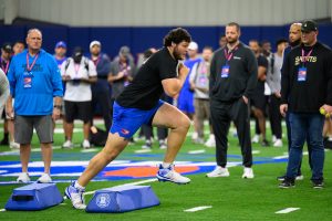 Offensive lineman Austin Barber runs during Pro Day inside the Heavener Football Training Center, on March 26, 2026. [Noah Lantor/WRUF]