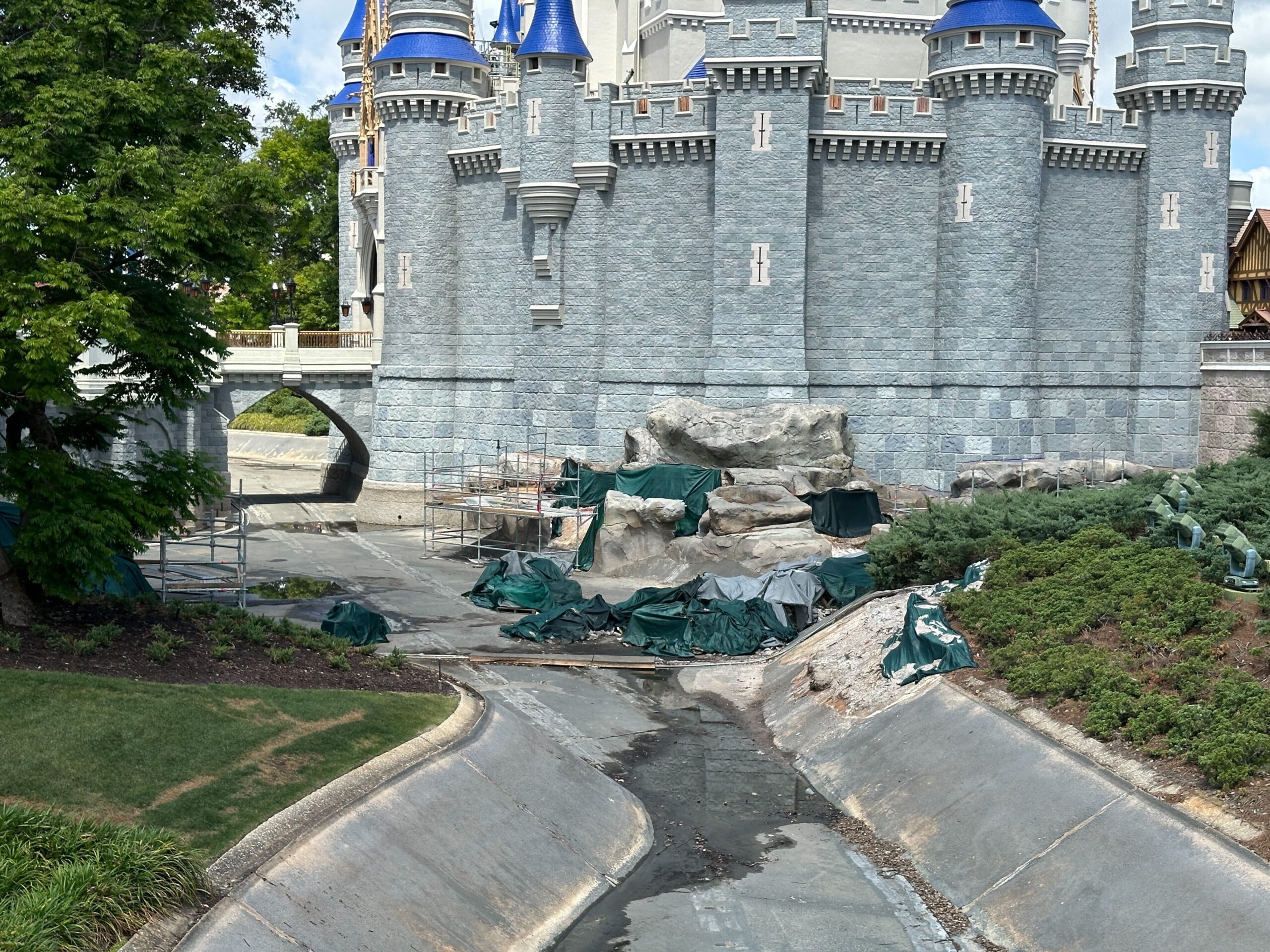 Disney also used the moat draining to finish repainting the Tomorrowland entrance rocks.