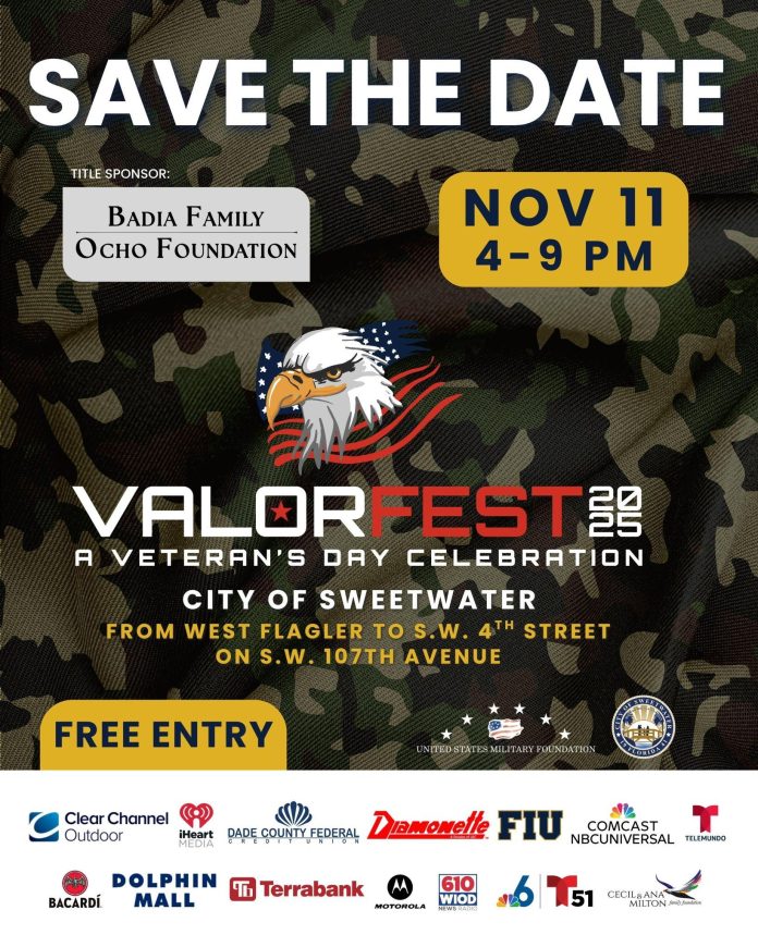 The United States Military Foundation, in partnership with the City of Sweetwater, will host ValorFest 2025, a community celebration honoring America’s veterans on Tuesday, Nov. 11, from 4 p.m. to 9 p.m. along W. Flagler Street and S.W. 107th Avenue.