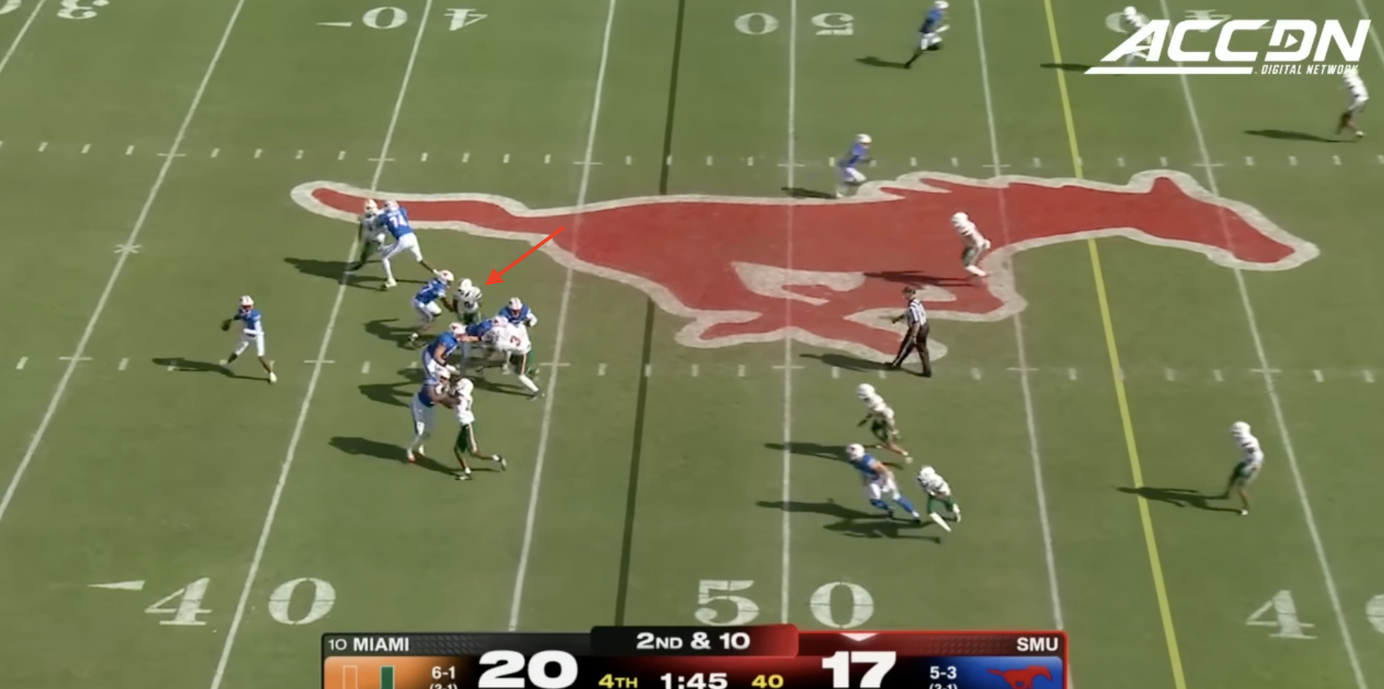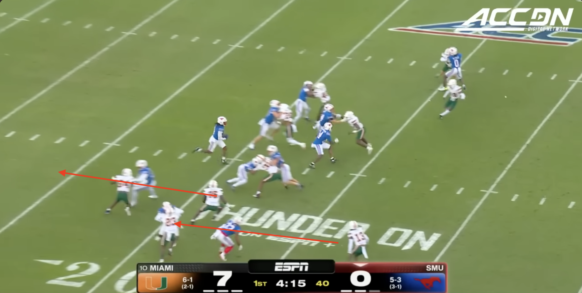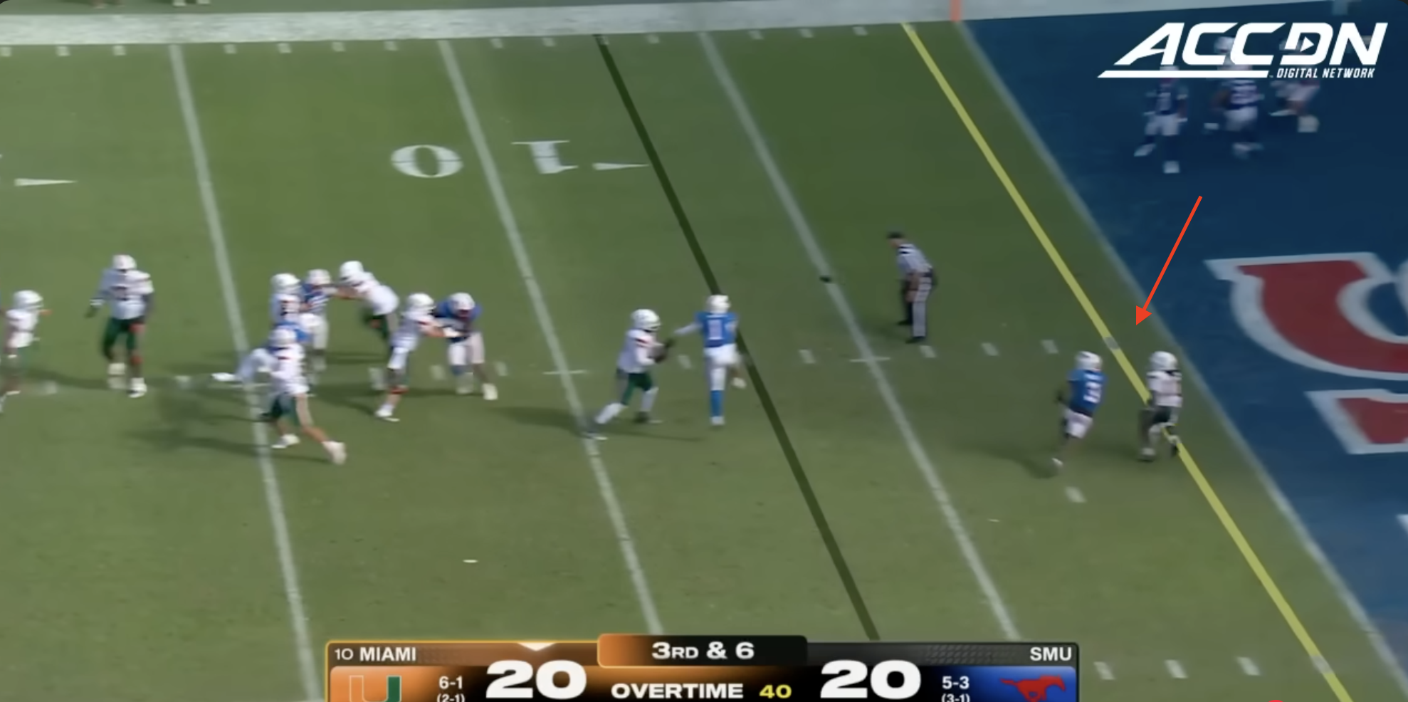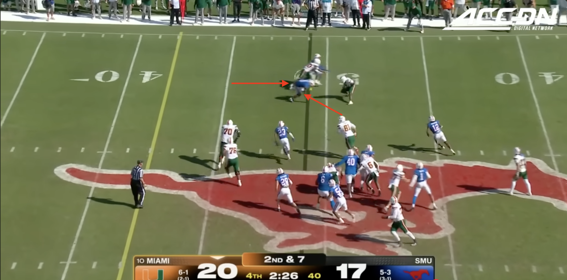 Miami was plagued by penalties once again including multiple pre-snap violations that included another James Brockermeyer snap infraction. Alex Mirabal can’t coach centers and clearly can’t pick ‘em anymore either. What a disaster this portal pick-up has been. This time Miami was flagged for 96 yards to SMU’s 40.