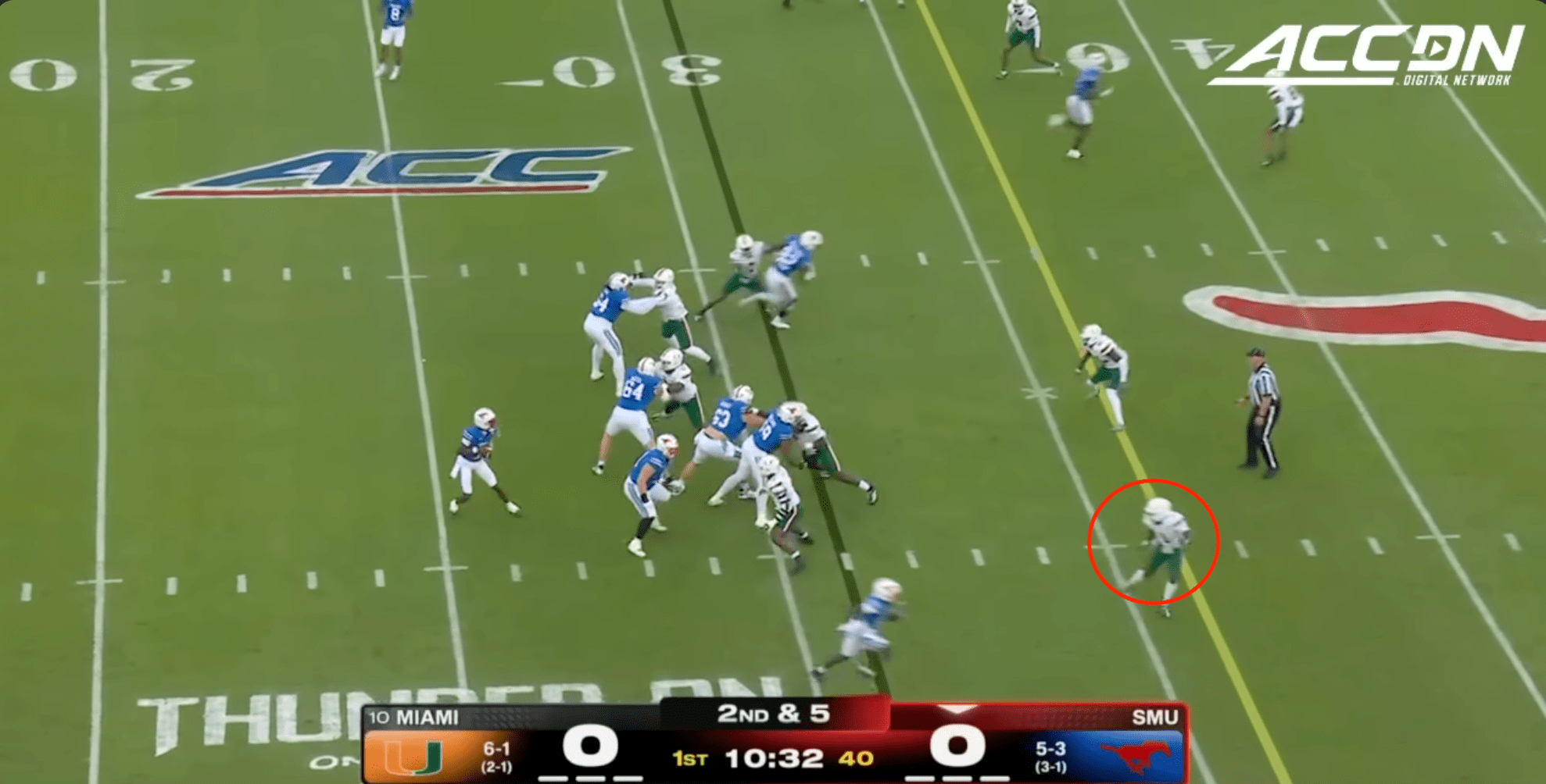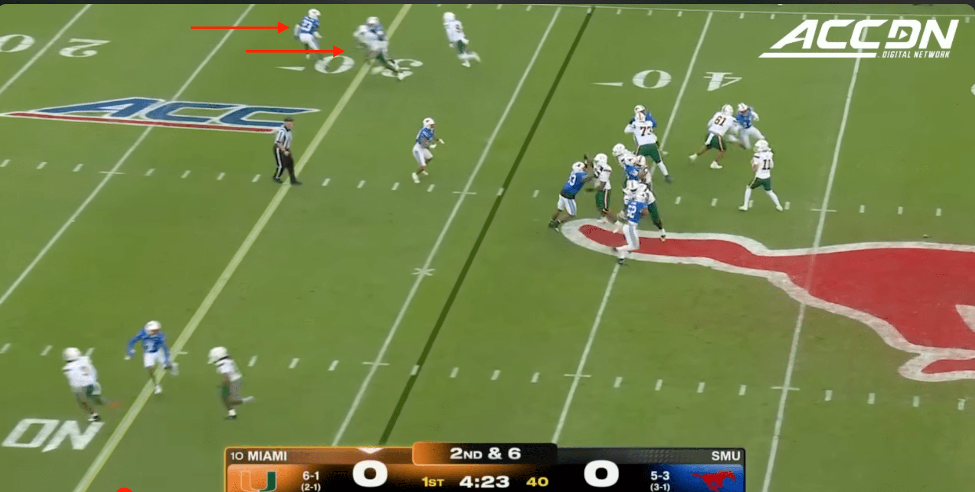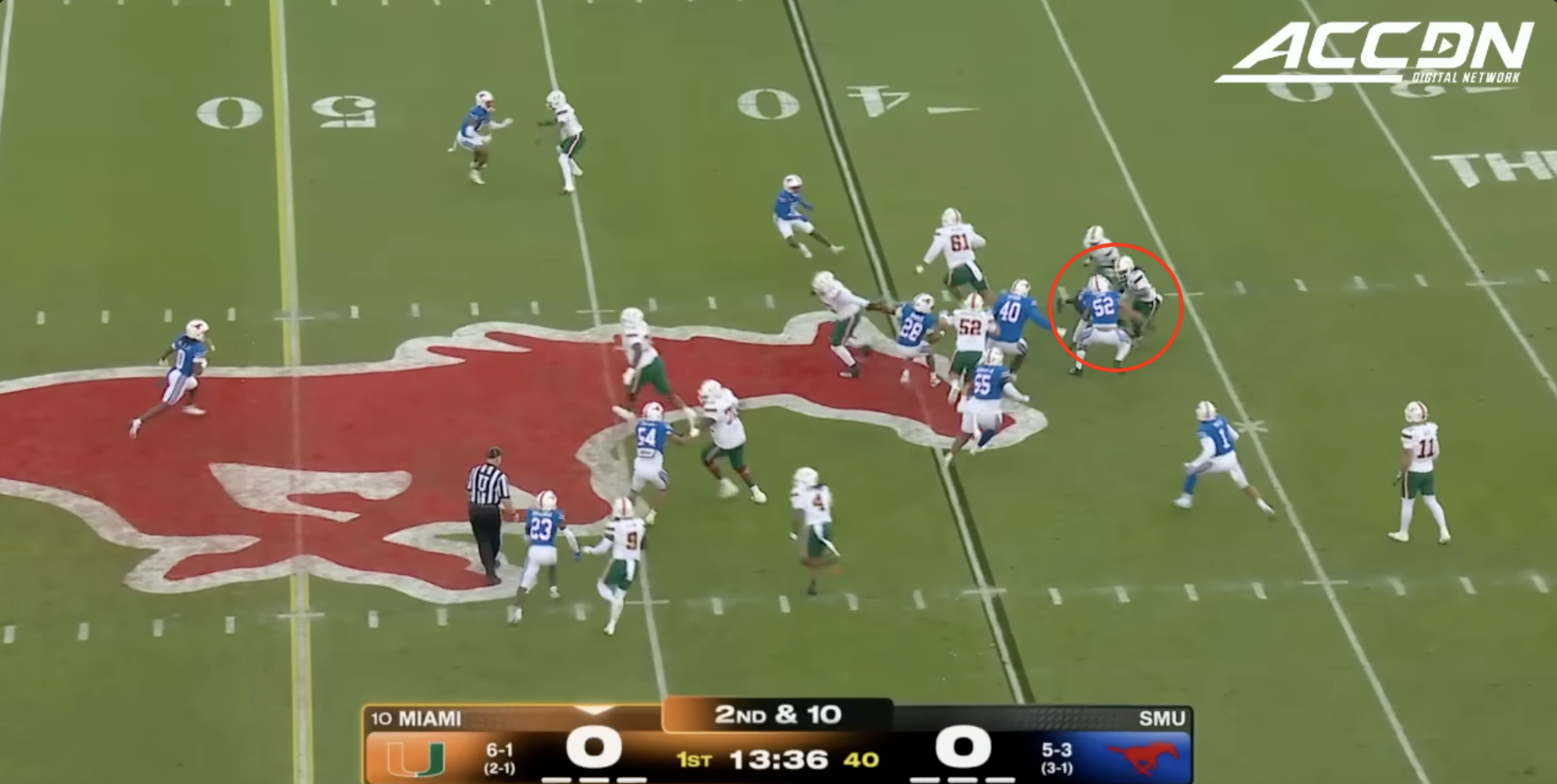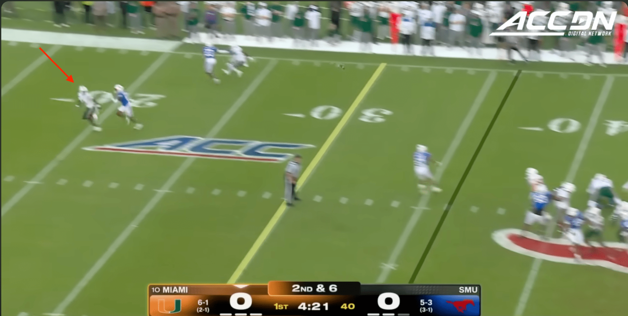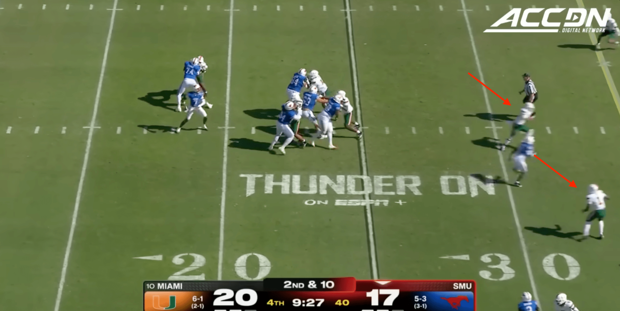 Miami was plagued by penalties once again including multiple pre-snap violations that included another James Brockermeyer snap infraction. Alex Mirabal can’t coach centers and clearly can’t pick ‘em anymore either. What a disaster this portal pick-up has been. This time Miami was flagged for 96 yards to SMU’s 40.